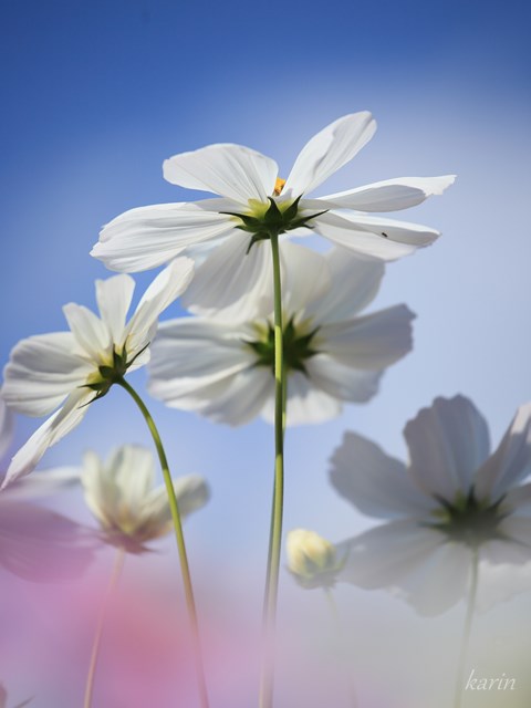 白色のコスモスの花言葉は 「優美」、「美麗」、「純潔」 です。純白の花は、清楚な純真さと、凛とした美しさがあって、真っ青な青空を背景に咲いている様子にはとても爽やかな雰囲気がありますね。濁りも汚れもない美しい花を見ていると、私たちの心も浄化されるような気がします。