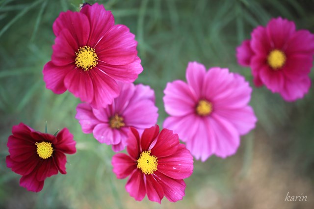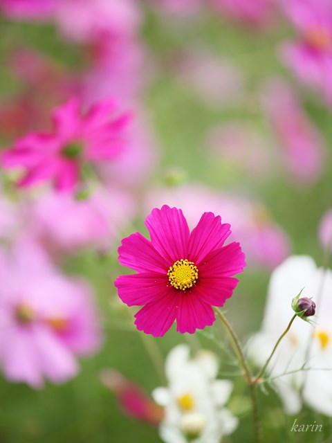 赤色のコスモスの花言葉は「乙女の愛情」、「調和」です。真っ赤ではなくて、少し紫ががった濃いピンクのコスモスが多いのですが、赤というとやはり愛のイメージ。そして人を愛する気持ちが調和を生みます。コスモスの花は淡い色合いが多い中で、このような濃い色合いの花が数輪あるだけでも引き締まって、またピンクや白を引き立てる役割もしてくれますね。