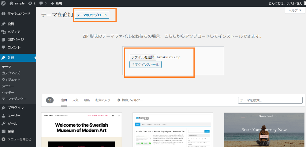 テーマを追加する画面で、「テーマのアップロード」を押下します。次に、「ファイルを選択」を押下し、自分が持っているzip形式のWordPressテーマを選択します。最後に「今すぐインストール」を押下し完了です。