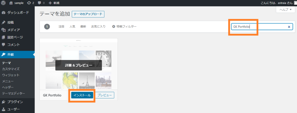 該当のテーマが検索されたらインストールを選択します。ここで、ライブプレビューを押すことでテーマのデモを見ることができます。