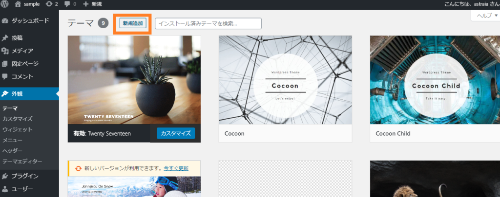 WordPressのダッシュボードから外観⇒テーマと選択し、新規追加を押下します。ここまでは、公式テーマを検索してインストールする場合と同じです。