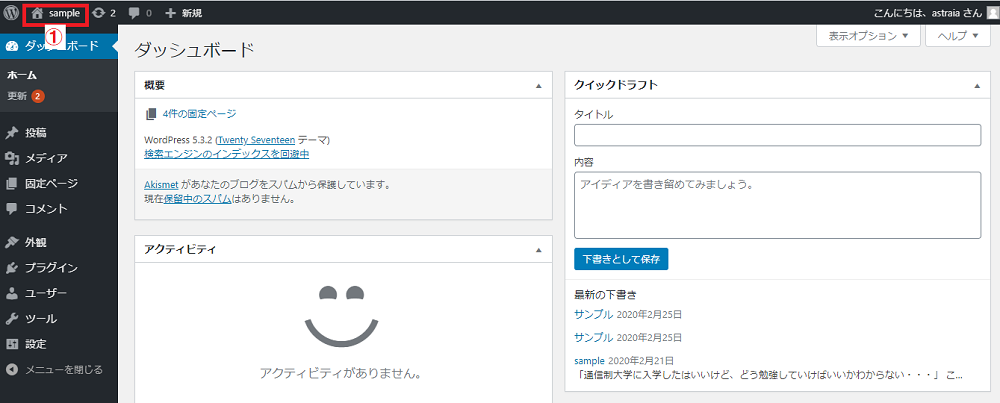 ①番のサイトのタイトル名⇒サイトの表示をクリックするとトップページに移動します。同様に、サイトのタイトル名⇒ダッシュボードをクリックすると管理画面(ダッシュボード)に移動します。