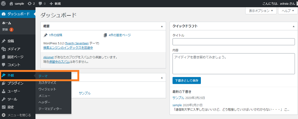 テーマとは、サイトの外観を変えるスキンのようなものです。テーマをダウンロードして有効化すると、サイトが一瞬でそのテーマのデザインになります。