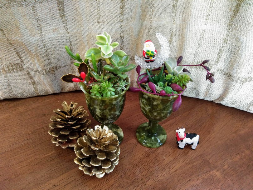 ⑨もう1つの入れものにも順番に植え付けます。こちらは、順番に真ん中に不死鳥を植え、つぎにベビーサンローズ、ブロンズ姫、若緑(クラッスラ)、最後にセダム(覆輪万年草、タイトゴメ)を植えました。飾り付けとして、今回はクリスマス用にサンタさんやクリスマスの飾りを付けました。クリスマスのムード作りにいかがでしょうか。