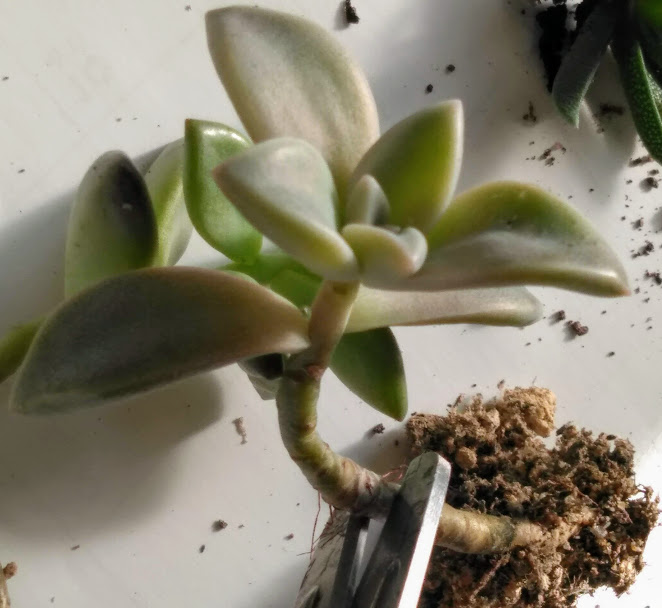 ②大きな根のある多肉植物や下になってもよいものから植え付けます。根のある多肉植物は根をハサミで切り、整えます。全部切っても育ちますので、安心して切ってください。根の長いまま植え付けると根つまりを起こし育ちが悪くなることもあります。