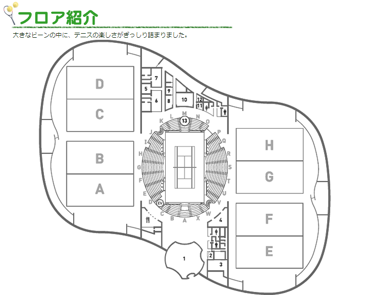 室内コートはサブコート8面に加え、センターコート1面の計9面が用意されています。
