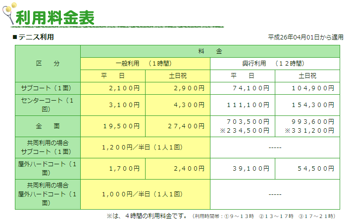 例えば大人4人でサブコートを1時間使用した場合・・・