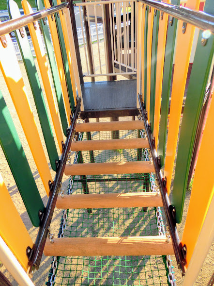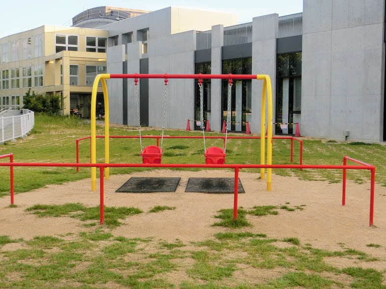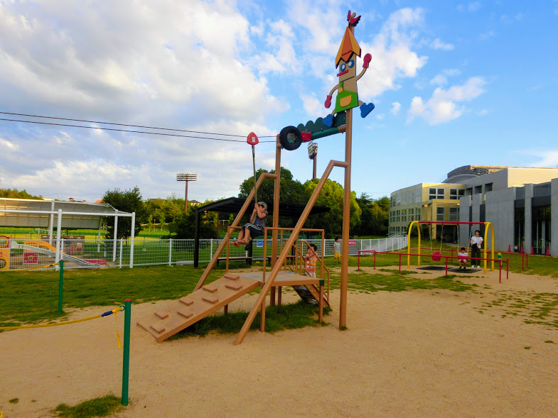 その続きの体育館脇の広場にはターザンロープと幼児用ブランコがあります。ターザンロープは6~12歳用ですが、ブランコは着座式なので小さなお子さんも遊べます。