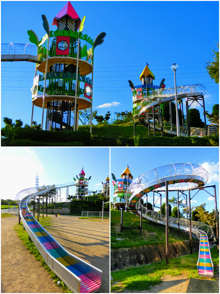さらに大型遊具の隣の丘には、みきっこランド目玉のローラーすべり台が2台あります。丘の上にある方が40mの廻旋型、手前にあるのが45mの直線型です。