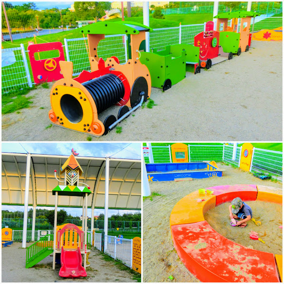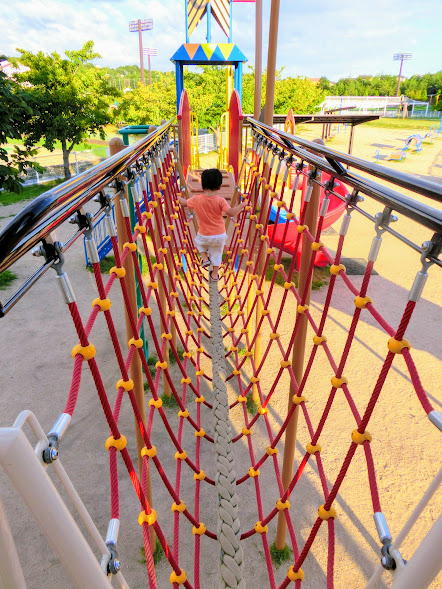 健康遊具エリアとターザンロープの間の小道から下へ降りると、乳幼児遊具エリアがあります。すぐ後ろが野球場なのでファウルボールが飛んでこないよう、安全面に考慮されています。向かって左側が1~3歳用、右側が3~6歳用に分かれて遊具が置いてあります。1~3歳用は白いフェンスで囲まれており、 2つの砂場や汽車の遊具があり、3~6歳用には小さめのローラーすべり台やクライミングウォールなどがあります。