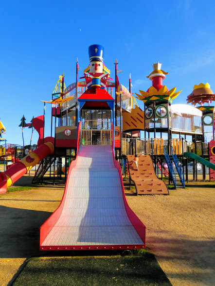 まず最初にカラフルで可愛い遊具が目に飛び込んできます。 こちらは6~12歳を対象とした大型遊具で、童話ピノキオとお城をモチーフにされています。 4階建てで、トンネル状や幅の広いすべり台に吊り橋、ロッククライミングのような壁登りや、縄梯子などがあります。お子さんたちが目を輝かせることは間違いなし!