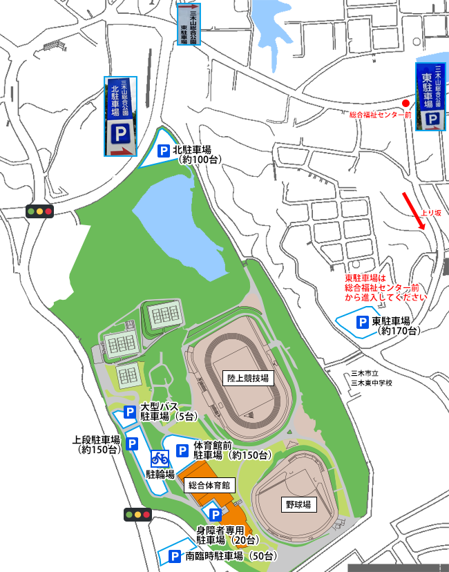 三木山総合公園には無料の駐車場があります。公園敷地内にある、近接駐車場と臨時の外周駐車場があります。みきっこランドに遊びに来たときは近くの駐車場に停めたいところですが、週末は各スポーツ大会が開催されたり、みきっこランドに多くの家族連れが訪れたりと、場合によっては駐車待ちの車が道路に列をなすほど満車のときもあります。状況に応じて使い分けましょう。